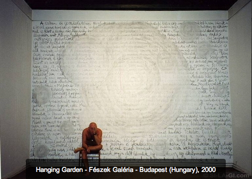 He has remixed Heart Sutra (1966) many times in different way. My absolute favorite, however, is Hanging Garden (2000). Here, you can see how he covers up parts of the wall in circles. In fact, it almost looks as though he erased it parts of the wall completely. The only thing that keeps me from believing that he actually removed those parts of the sutra is that he does it over and over again on different parts along the wall. The effect of covering up these spots suggests a similar layout to that of a Japanese rock garden. Japanese rock gardens are forms of art in it of themselves, which display the practice of Zen Buddhism.